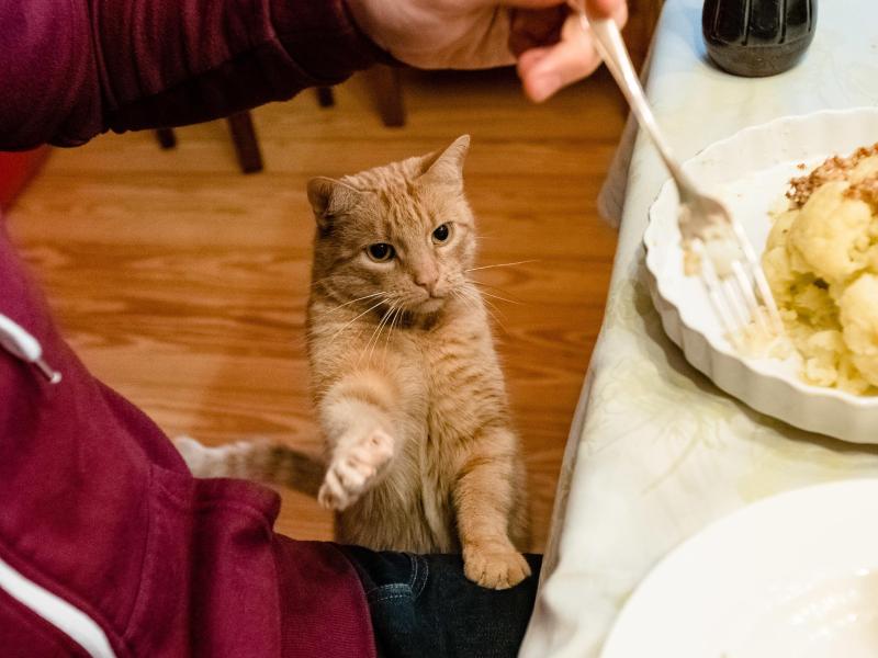 katze bettelt um essen am tisch wie abgewohnen