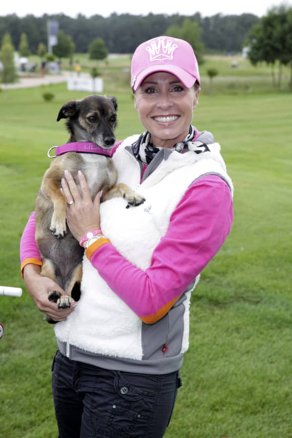 stockfoto sonja zietlow futtert ihren hund auf dem golf